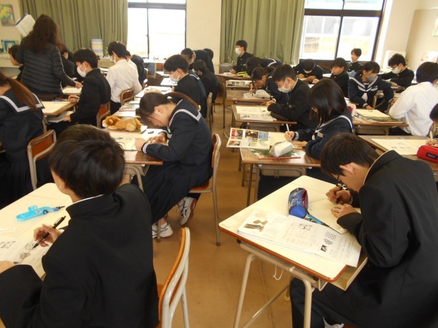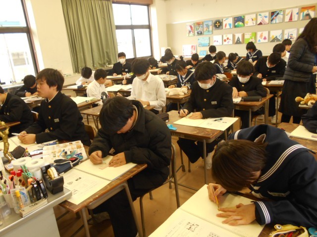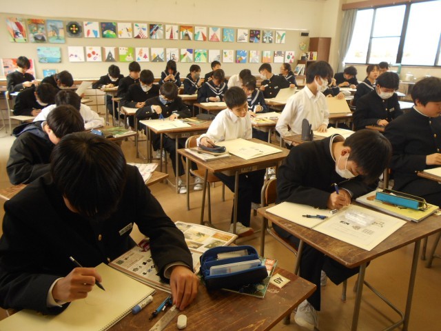 美術 麻の葉の文様をコンパス、定規を使って描いています。日本の伝統文様の素晴らしさや高いデザイン性にふれることができました。