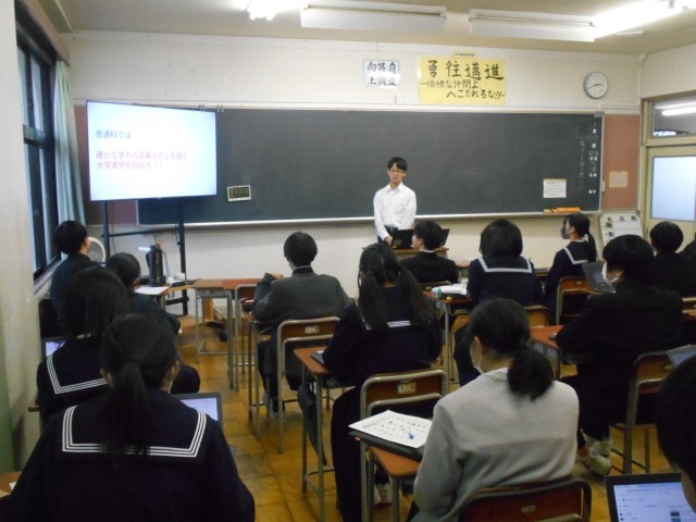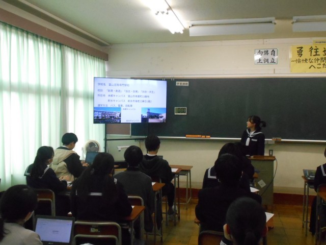 2年生 上級学校調べ発表会(その1) 公開日 2025/01/17 更新日 2025/01/17 2年生 冬休み中に行ってきた上級学校調べの発表会を行いました。まずは、「県立高校・国立高専」編です。各自、興味のある高校の特色等をスライドにまとめ、分かりやすく発表しました。個性的なスライドが多く、また、同じ上級学校の発表でも、異なる視点での情報が集まり、大変聞きごたえがありました。皆さんにとって、多くの学びが得られた時間になったようです。