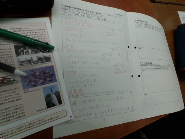 現在、修学旅行での広島訪問に向けて平和学習を行っています。まず、映像教材等で日本が戦争を行うことになった経緯や当時の国民生活について学び、その後、広島平和記念資料館からいただいた学習ハンドブックを活用して、広島に原子爆弾が投下された理由や被害の様子について学びました。ワークシートに学んだことを各自でまとめて、班ごとに共有して学びを深めました。