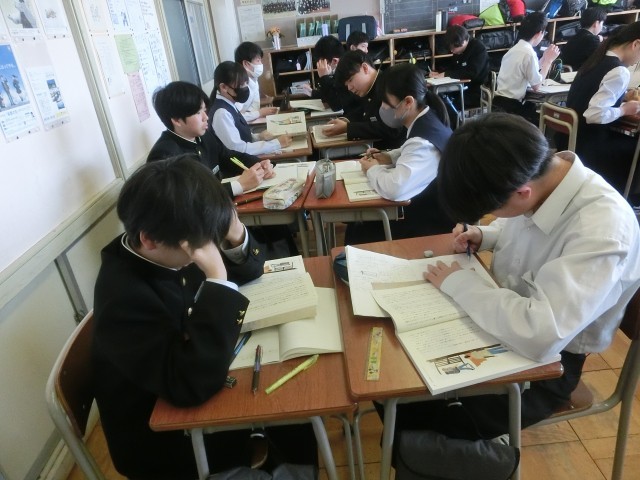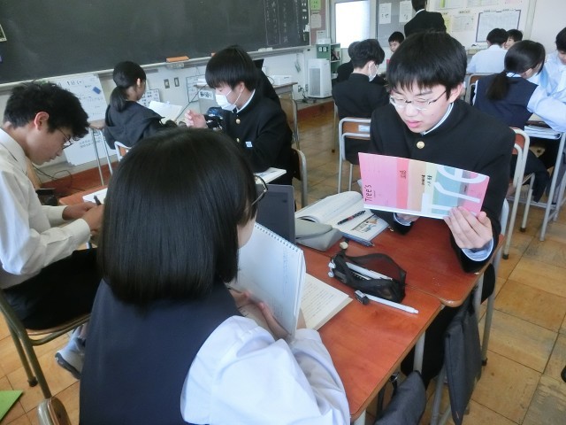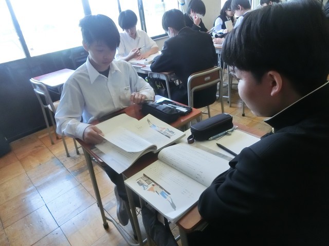 国語 『アイスプラネット』の続きです。課題について考えた自分の意見をペアで話し合っています。