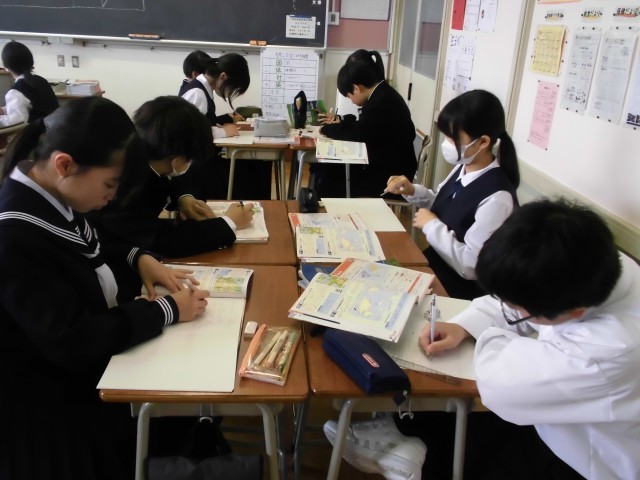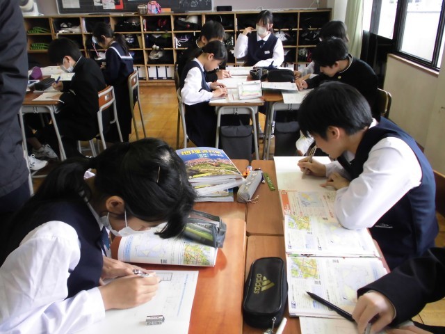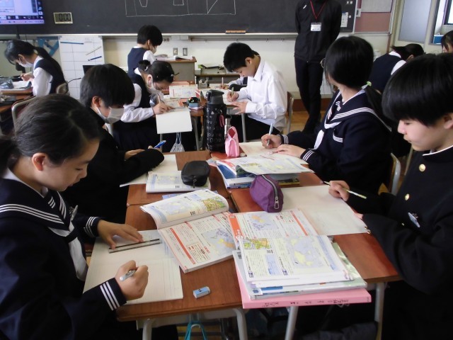 社会 世界地図の種類を学び、それぞれ何を正確に表したものなのか習いました。班になって略図も練習しました。