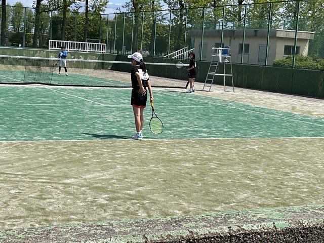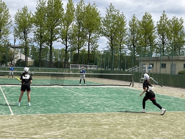 ソフトテニス部は、富山市強化練習会で、岩瀬スポーツ公園で練習試合をしています。たくさんの試合を経験できる、よい機会です。自分たちのプレーを互いに評価しながら、練習に励んでいます。