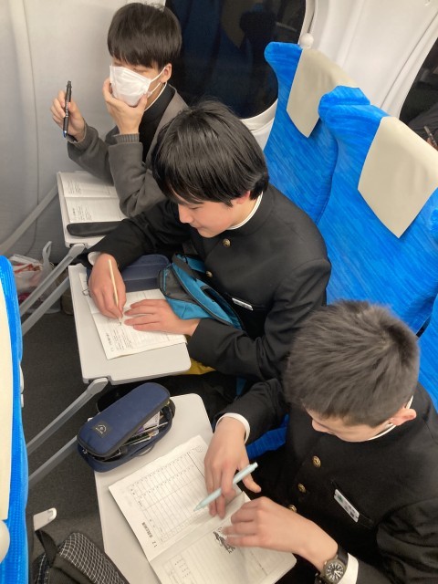 のぞみ号の車内では、しおりに1日の振り返りを記入しています。