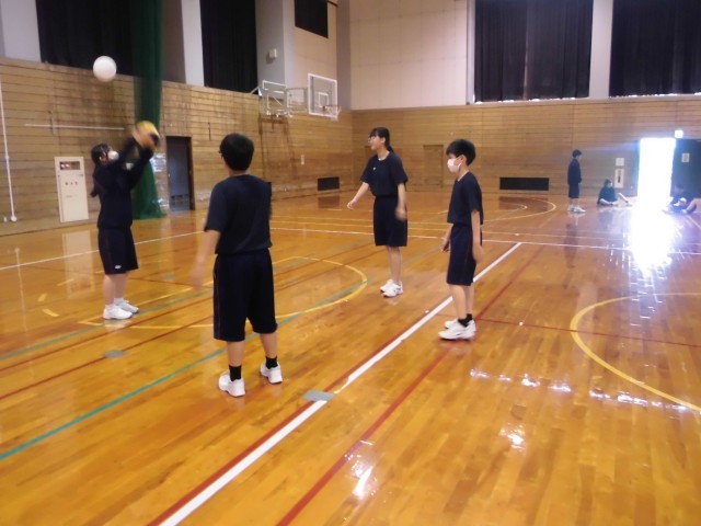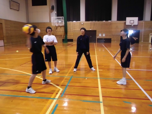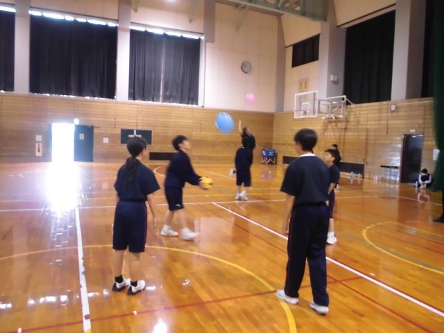 体育 4人グループになって、1つのバレーボールをパスしながら風船を打つゲームをしていました。声を掛け合いながら、楽しそうにプレイしていました。