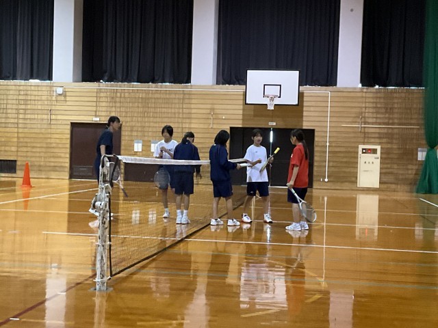 雨の日の部活動 公開日 2025/06/02 更新日 2025/06/01 2年生 今日はあいにくの雨でしたが、ソフトテニス部は体育館を全面使って練習しました。1年生に審判の方法を教えるなど、有意義な練習でした。