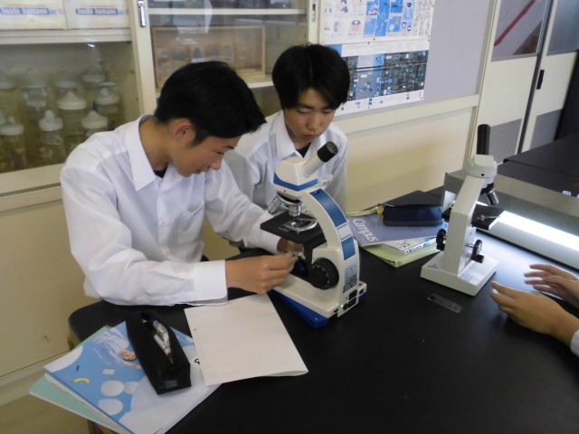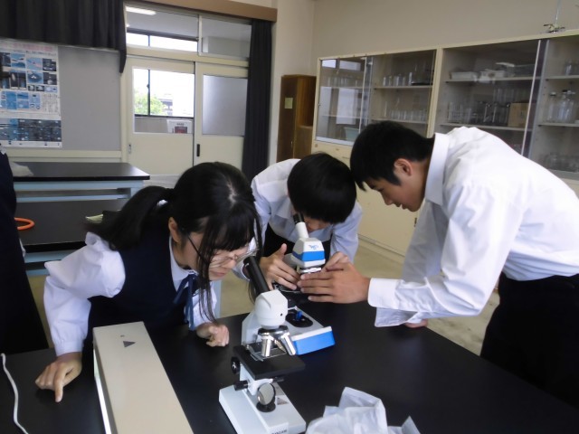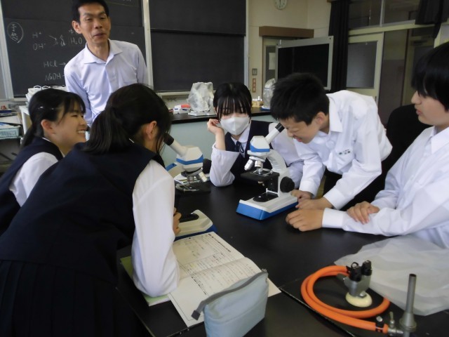 理科 塩酸と水酸化ナトリウムを混ぜ合わせるとどうなるのか実験中です。今日は、混ぜ合わせた水溶液の水を蒸発させ、残った物質を顕微鏡で確認しました。