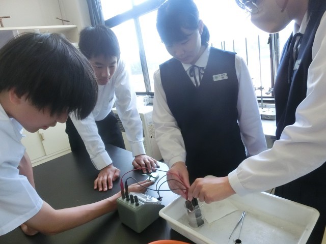 理科 2種類の金属板と水溶液の組み合わせを変えて、電流を取り出すことができる条件を調べる実験を行いました。
