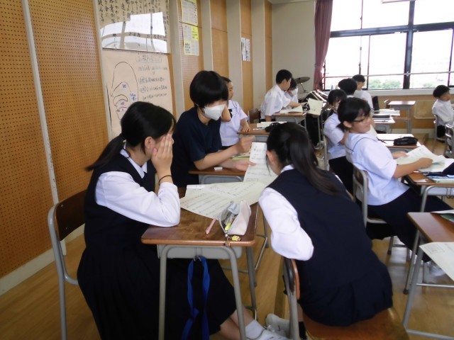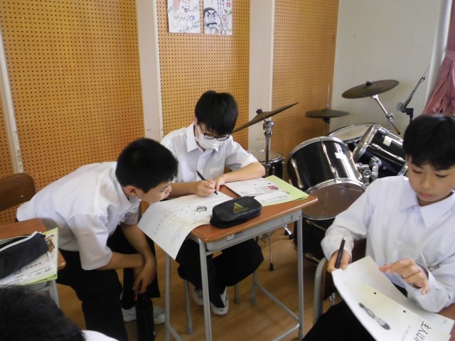 学習の様子 1年 公開日 2025/06/10 更新日 2025/06/10 1年生 音楽 「主人は冷たい土の中に」を鑑賞しました。楽譜を見ながら階名(ドレミ)を書いたり、曲全体の構成を考えたりして、曲を読み解いていました。教え合ったり、確認し合ったりする姿があちこちで見られました。