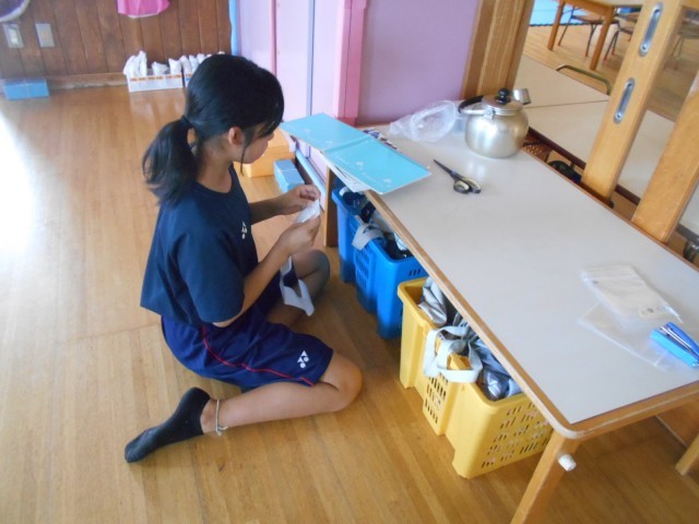 介護老人保健施設レインボーでは、利用者さんの入浴後のドライヤーがけや水分摂取の補助などを行い、利用者さんと直接交流しない時間には、袋をたたんだり、車いすの清掃を行ったりしているそうです。年齢の違いや初めての活動に戸惑いがあるようですが、少しずつできることから取り組んでいるようです。