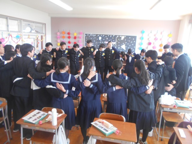 最後に教室で円陣を組みました。玄関前では、3年間お世話になった校舎に「ありあとうございました」も伝えました。