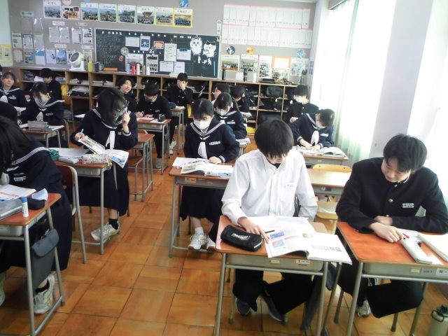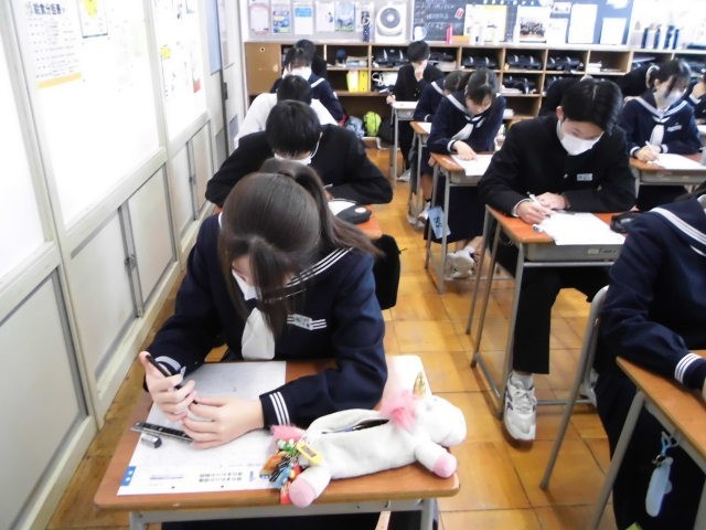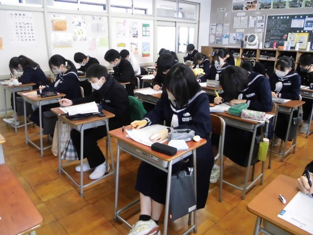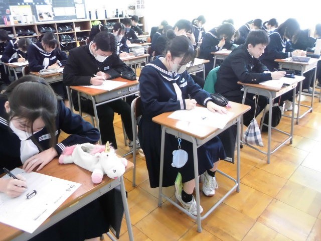 理科 最後の単元『自然と人間』の学習です。温暖化、自然災害、環境の保護について各自でワークシートに書き込みをしています。