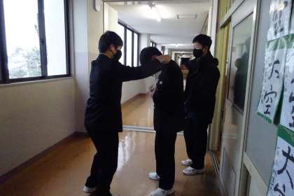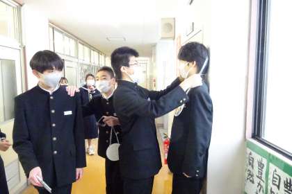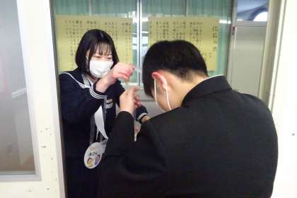 同級生同士で、先輩が後輩へ、後輩から先輩へ、生徒から先生へ、先生から生徒へと挨拶を交わしながらつないでいきました。そのやりとりの場面はみんな笑顔でした。朝からたくさんの笑顔と明るい挨拶の声で、とても気持ちのよいスタートになりました。 -