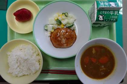 今日紹介する本は、「小さなおばけシリーズ」です。小さなおばけシリーズの主人公、おばけのアッチは、くいしんぼうでいたずら好きな小さなおばけ。レストランのコックさんとして活躍します。今日は、アッチのレストランを再現した献立でした。豆腐ハンバーグはふわふわでおいしく、のらねこスープはカレー味で中には、小さなアルファベトパスタが入っていました。いちごの大きさにも感動!