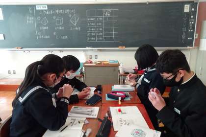教科書の付録に付いている正多面体の模型を実際に作って、その模型を見ながら考えたり、確認したりしました。 -