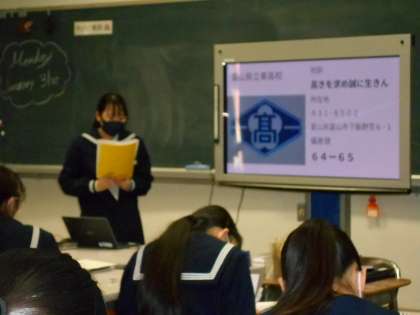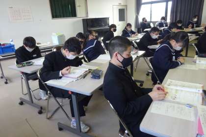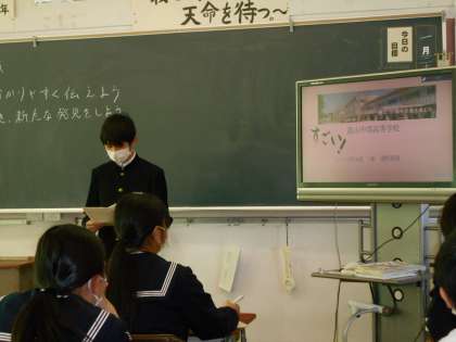 各自が興味のある高等学校や高等専門学校について調べ、パワーポイントでまとめたものを、画面に提示しながら発表しました。それぞれの学校の学科や教育課程、行事、部活動、進学先等を分かりやすく工夫してまとめていました。生徒たちはメモを取りながら、真剣に聞いていました。上級学校の様々な情報を知ることで、進路について新たな目標ができたようです。 -