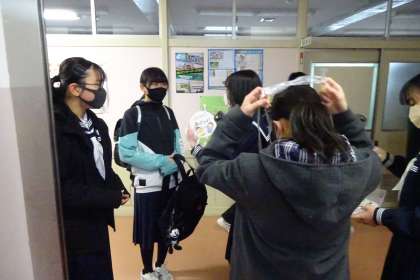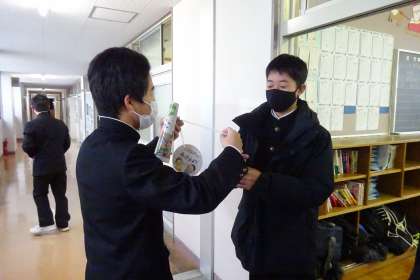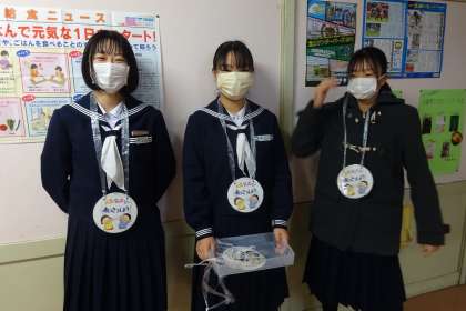 「あいさつリレー」とは7時45分から8時5分までの20分間、あいさつメダルをあいさつをした相手に渡してつないでいきます。「友達や先生、先輩、後輩などたくさんの人とあいさつを交わしましょう」と生徒会執行部から説明と呼び掛けがありました。(写真)