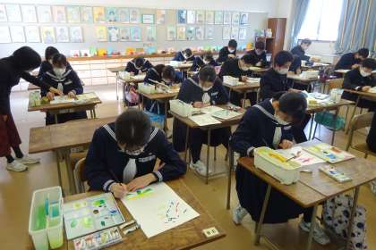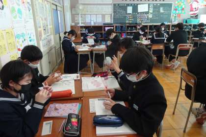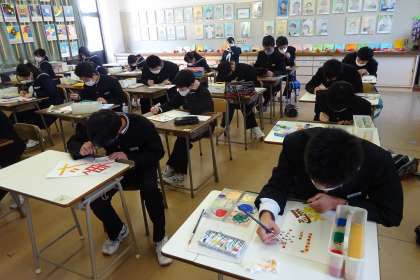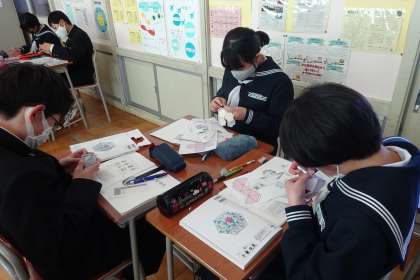 自分の名前のデザインに取り組んでいます。色塗りに入っている生徒がたくさんいました。いろいろな色を使って明るく鮮やかに描いたり、文字の中をさらに細かく模様を付けたりと工夫した作品がありました。 -