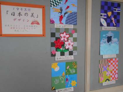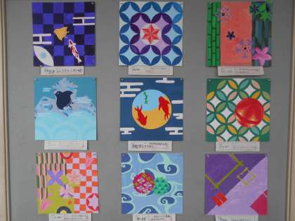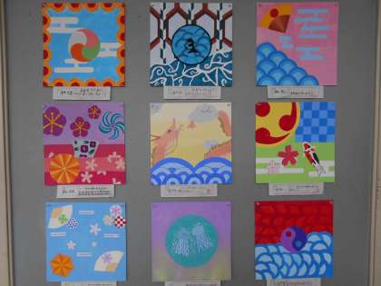 「日本の美」をテーマに、文様を構成したデザイン作品を仕上げました。日本の繊細な色を追究して、皆集中して彩色していました。