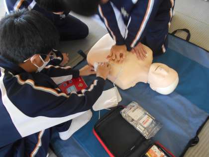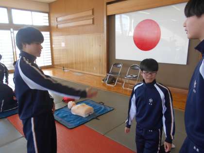 日本赤十字社富山支部の方を招いて救急救命講習が行われました。生徒たちは心肺蘇生法を学びました。何回も繰り返しやるうちに徐々にできるようになりました。今日学んだことを忘れないようにしていきましょう。