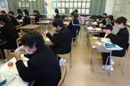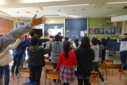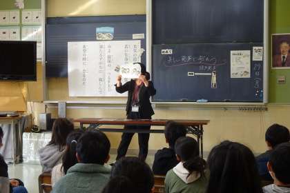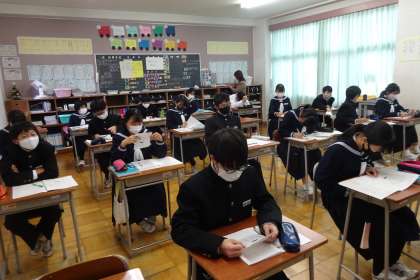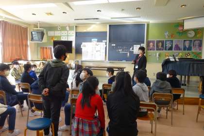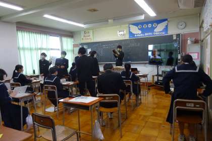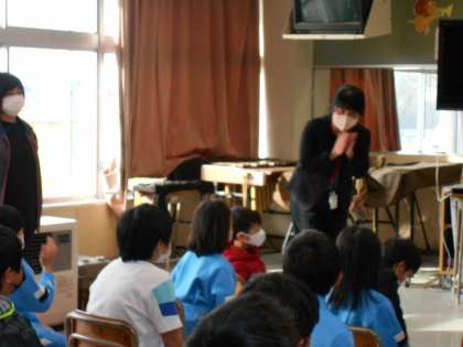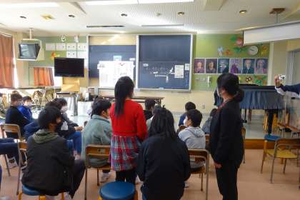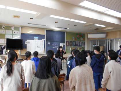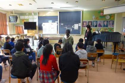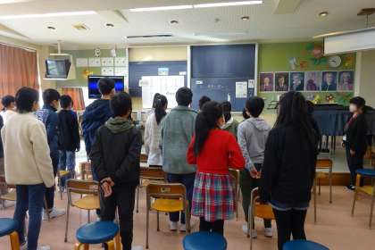 カモメや子犬の鳴き声を例にして発声練習をすると、素直にまねをして発声するなど熱心に取り組みました。校歌の歌詞にいても「銀嶺」ってどういう意味ですかと質問するなど意欲的に学習しました。 -