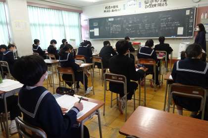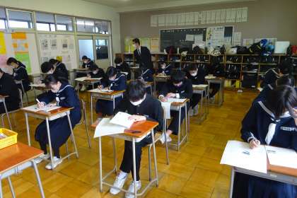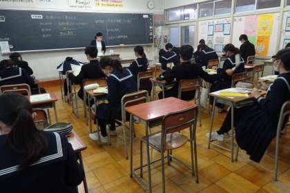 期末考査が返却されているところでした。落ち着いて雰囲気の中で、近くの友人と長文の理解について会話を交わしたり、間違えた箇所を見直したりしていました。