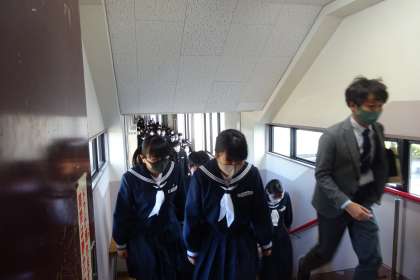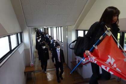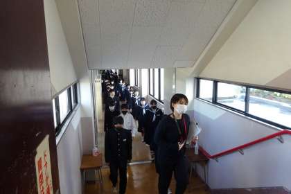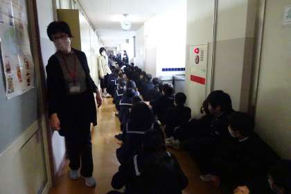 生徒は、「押さない、走らない、しゃべらない」を厳守して真剣に避難できました。先生も大きな声で人数を確認したり、報告したりしました。 -