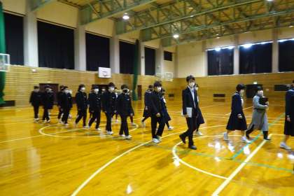 希望者を募って、朝、出身小学校にいって小学生の児童会の皆さんと一緒に、挨拶運動を行います。予想より希望者が多く集まりました。生徒会長から明日の動きについて確認がありました。
