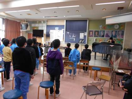 大きな声で校歌を歌って(写真上)、のりのりでまねっこ遊びを楽しんだり(写真中)、イントロクイズに参加したり(写真下)しました。イントロクイズでは、2音しか出ていないのに曲名をズバリ当てるなど、教室内がざわめきました。当たった曲を、先生がピアノでサビの部分弾くと、自然と手拍子が始まりとても楽しんで授業に参加していました。 -
