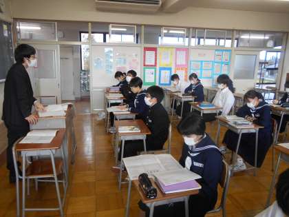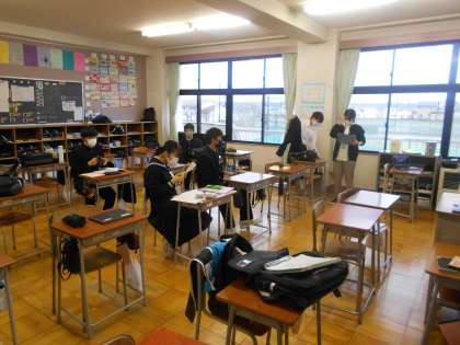 大津波警報が発令し、年長さん7名は本校生徒玄関前に避難してきました。