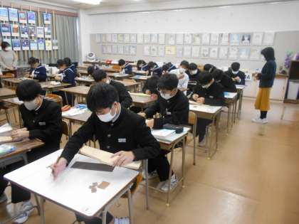 中:(美術2A)ハンガーの制作です。浮き彫りを活用して、自分のデザ