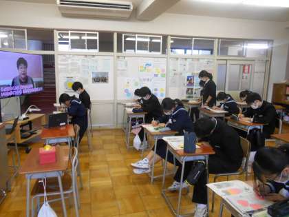 ハートの付箋に温かい言葉を書いて、クラスメイトに渡します。 -