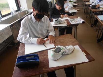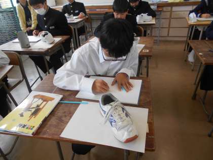 美術 「よく見て描こう」という課題で、自分の内履きシューズを描いています。