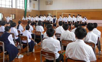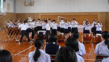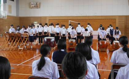 平成13年度から本校で続いている三成太鼓を、3年生から2年生へと受け継いでいくため、3年生が力強い演奏を披露しました。