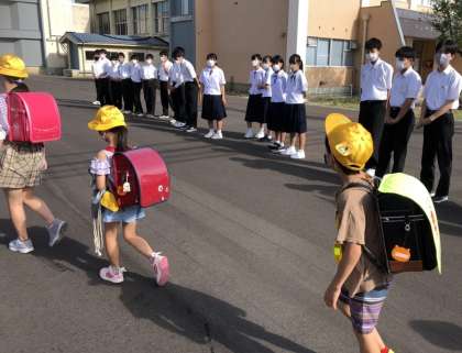 たくさんの生徒たちが参加し、元気にあいさつをしていました。