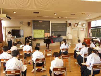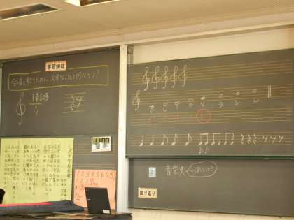 音楽の様子です。合唱に向けて楽譜の読み方を学んでいました。様々な合唱曲も鑑賞しました。