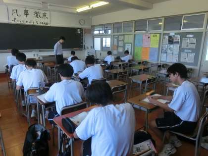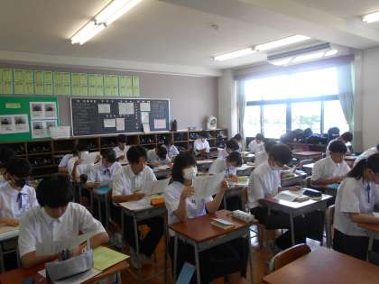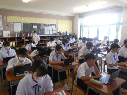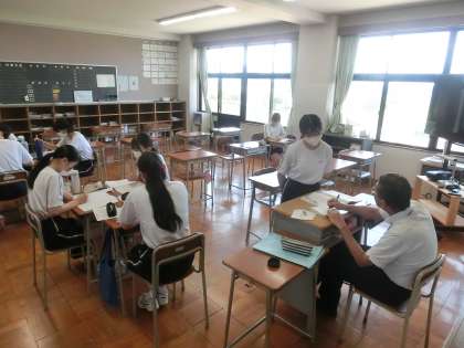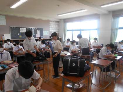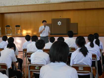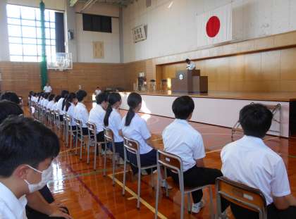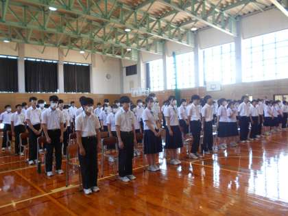 第1学期 終業式を行いました。生徒は、真剣な態度で校長先生のお話を聞いていました。式後、生徒指導主事の先生から夏休みの過ごし方についてお話がありました。安全に気を付けて、命・健康を一番に考えて過ごしましょう。困ったことがあれば、夏休み中でも気軽に相談してくださいね。