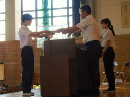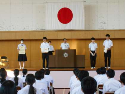 1学期に各分野で活躍した生徒の授賞伝達式を行いました。全校生徒の前で賞状を披露しました。