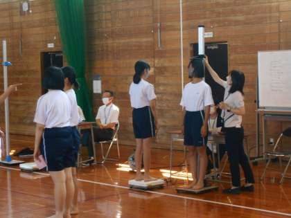 下:身長と体重の測定は、体育館で行っています。 -