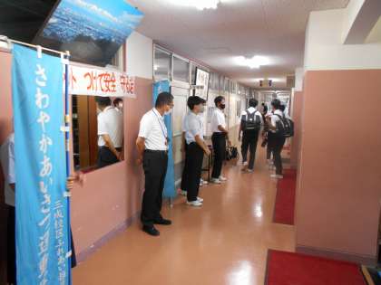 中・下:さわやかあいさつ運動の様子です。 -
