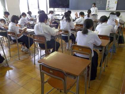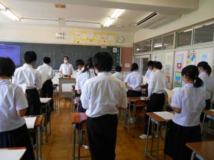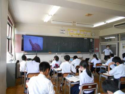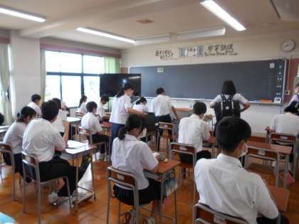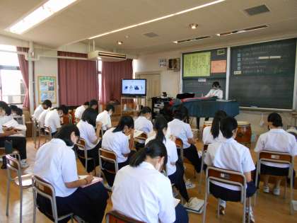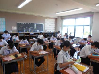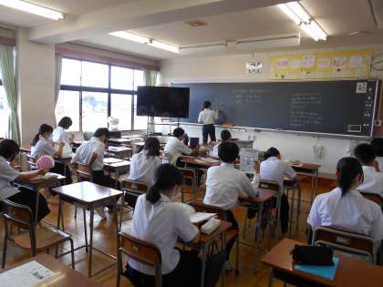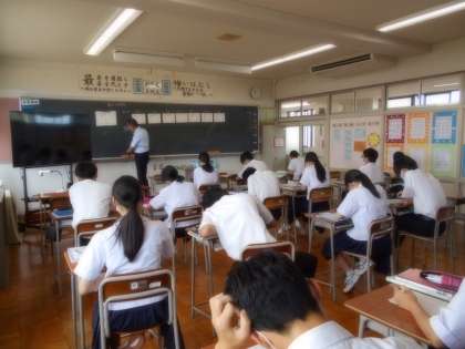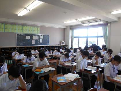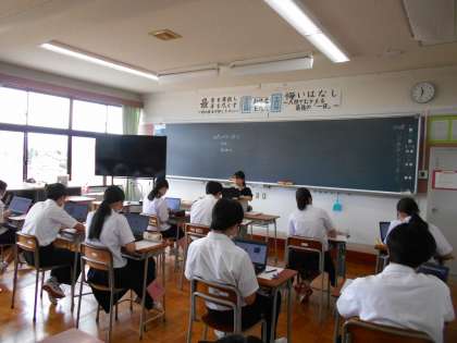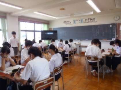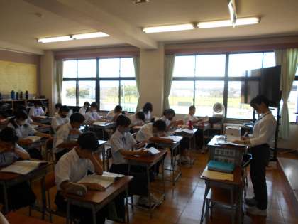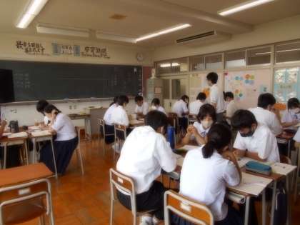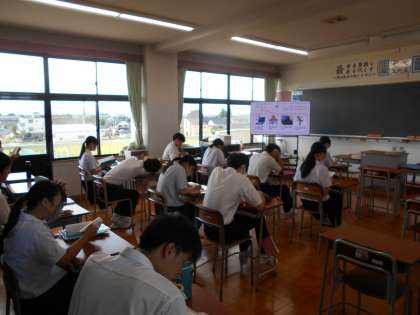 音楽の様子です。合唱コンクールにおいて「よい歌声で歌うためには、何を意識すればよいか」を各自考えています。