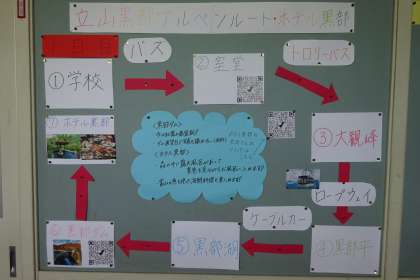 今週から富山県のステージが2となり、修学旅行が実施できる見通しが立ちました。廊下には、実行委員会が作成した掲示物があります。クロムブックで、QRコードを読み取ると、詳細が分かるページにつながります。8日後です。心構えと準備を進めましょう。 -