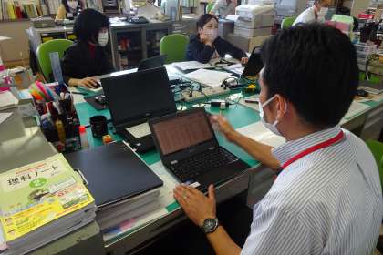 これまで、それぞれの先生方がクロムブックをどのような場面で、どのように活用したかを、紹介し合いました。実際に活用したスプレッドシート、ジャムボード、スライド、Googleフォーム等をみてもらい説明し、質問をして学び合いました。