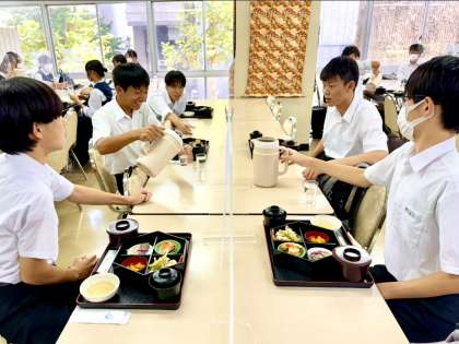 A組のお昼は、和食御膳です。ごはん、天ぷら(海老、南瓜、ししとう、大葉)、炊合せ(有頭海老、にしん昆布巻、ふき、味付あげ巻)、ごはん、味噌汁、漬物、でした!美味しかったです。