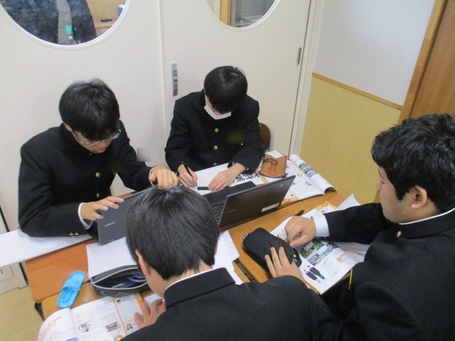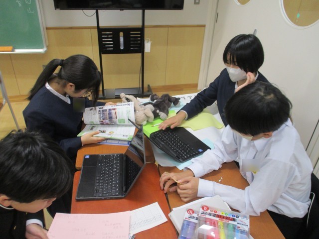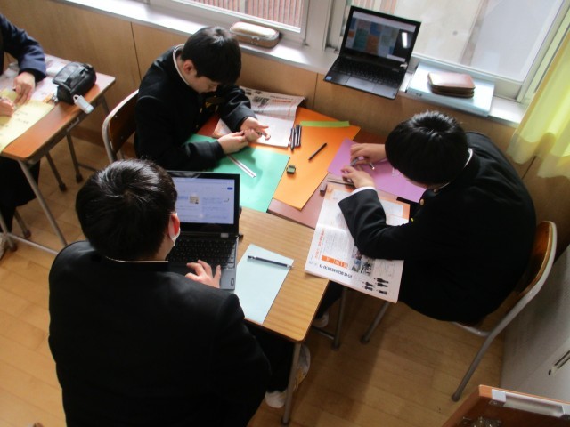 総合的な学習の時間に進路学習を進めています。これまでいろいろと調べてきた高等学校について掲示物を作成する段階に入りました。