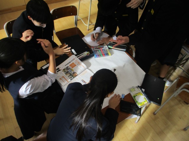 グループごとに担当する学校を決めて作ります。見やすく、分かりやすいものするため、レイアウトや文字の大きさに加え、目を引き付けるための工夫もしたいと相談する姿も見られました。
