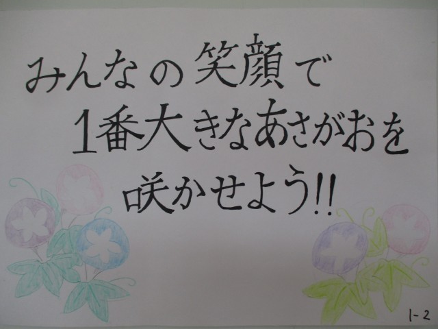 10月22日(水) 1学年 「玄関掲示の様子」 公開日 2025/10/22 更新日 2025/10/22 1年生 生徒玄関には生徒活動発表会のスローガンが張り出されました。その横に、各クラスの合唱目標が添えられています。それぞれの思いがこもった合唱目標を達成できるように、残り3日間を大切に過ごしましょう!上 1年1組中 1年2組下 1年3組