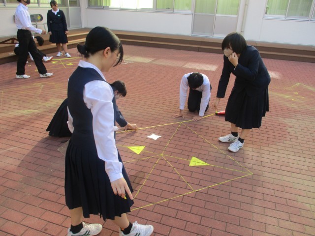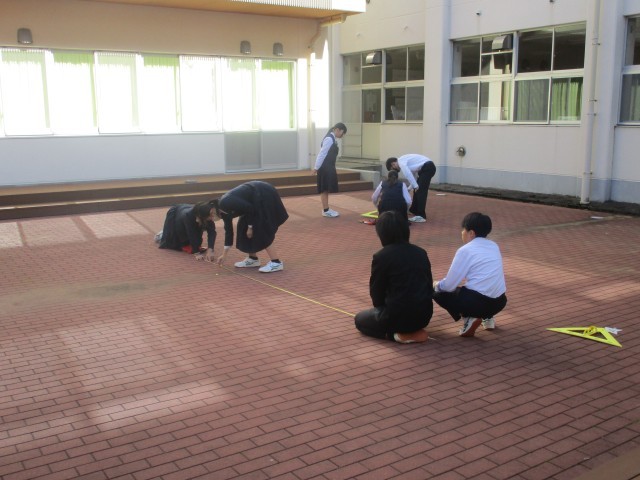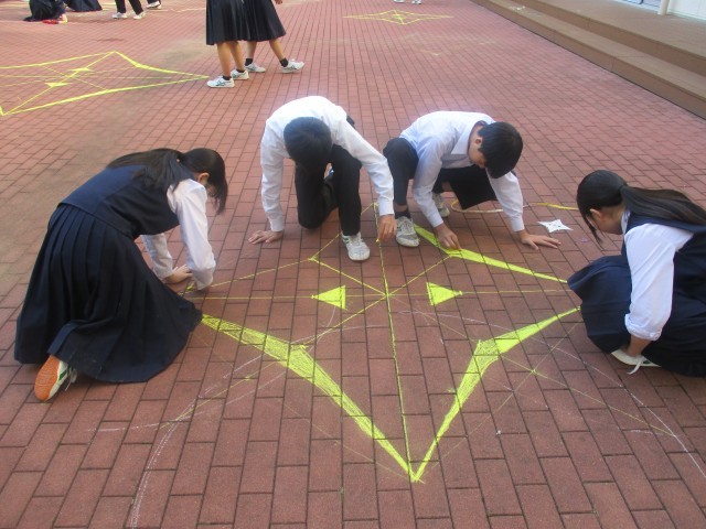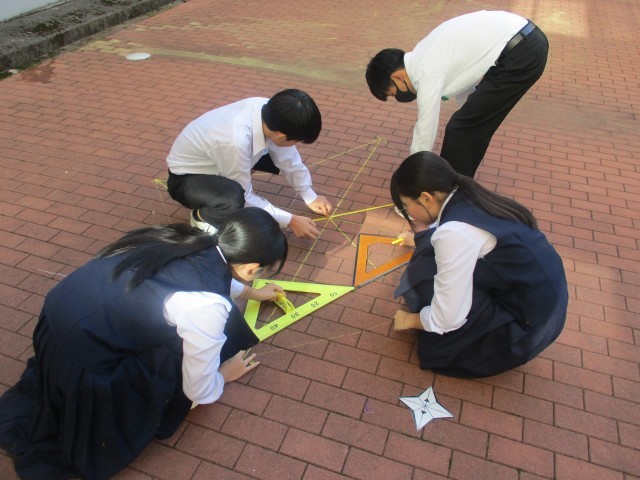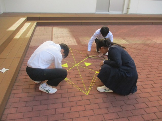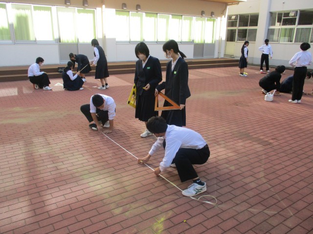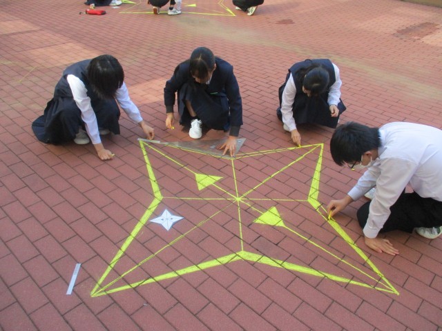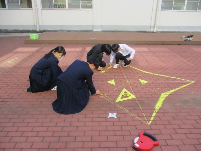 10月30日(木) 3年生「授業の様子」 公開日 2025/11/01 更新日 2025/10/30 3年生 先週の3組、昨日の1組に引き続き、今日は2組が中庭で数学の授業を行いました。グループで協力し、きれいに仕上げることができました。このあと、3年生の数学の授業では、相似な図形の学習を進めていきます。 +5