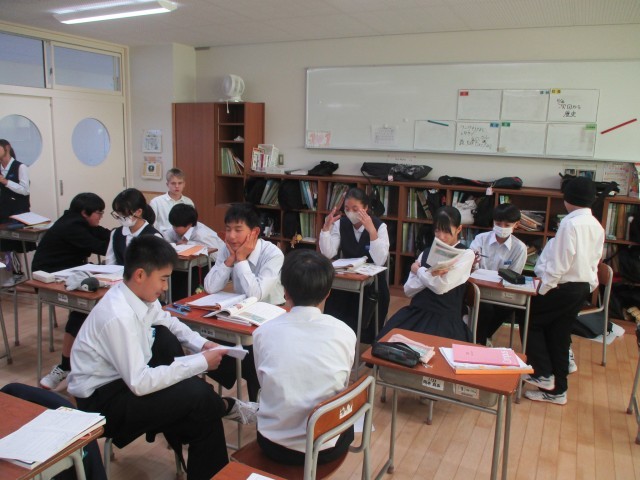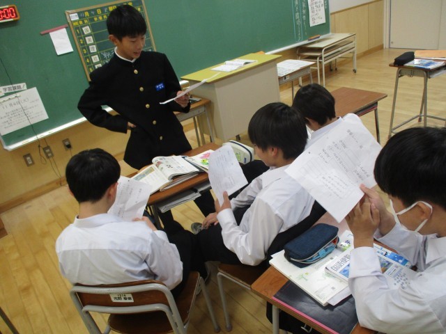 紫式部は『源氏物語』で『竹取物語』を「物語の出で来はじめの祖」と評しました。そんな1,400年以上昔に書かれた文学が現代を生きる和合中学校の一年生まで語り継がれてきました。生徒たちは一生懸命に暗唱に取り組んでいます。プリントを使って黙々と覚える生徒、友達とクイズ形式で覚える生徒、音読して覚える生徒。人によって覚え方はそれぞれですが、目的に向かって着実に取り組むことのできる時間でした。