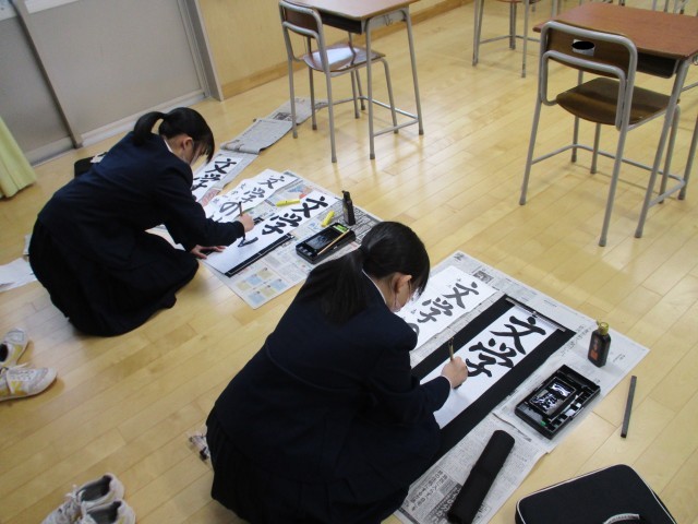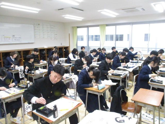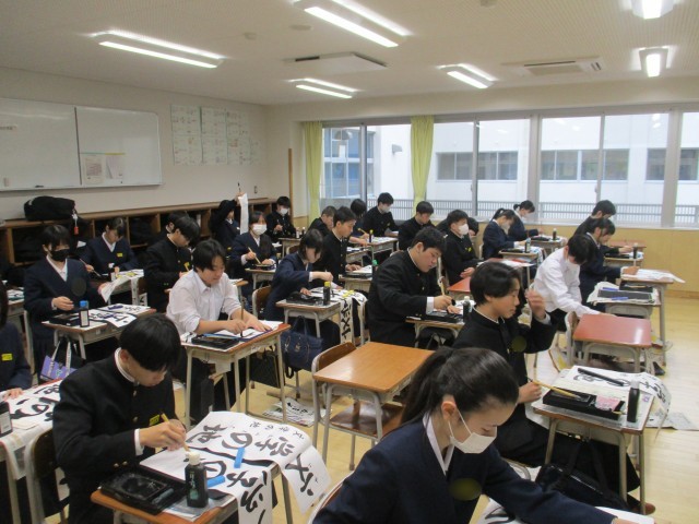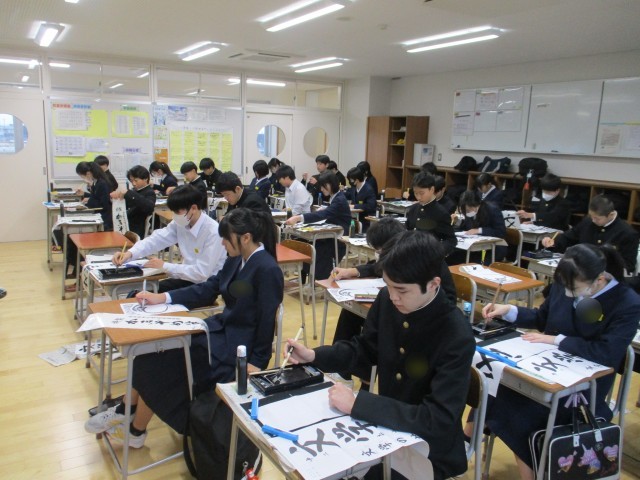 1月8日(木)2学年「書初大会の様子」 公開日 2026/01/08 更新日 2026/01/08 2年生 1月8日、3学期が始まりました。始業式のあと、恒例の書初大会を行いました。墨のにおいが教室に漂ってなんとも清々しい気持ちになります。皆、真剣な面持ちで筆を握り、書初用紙に向き合っています。静けさの中で、紙を準備する音、筆を走らす音だけが聞こえてきます。心静かに取り組む姿に、頼もしさを感じた一場面でした。 +3