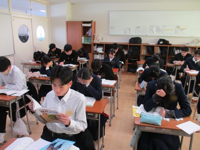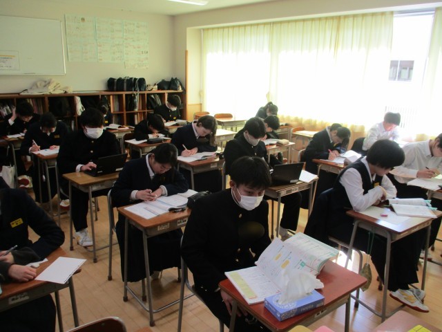 一人一人が、家庭で自分のペースに合わせた受験に向けての学習を進めています。今日は、進めてきた学習を振り返るテキストテスト実施しました。ひとりひとの計画が進度もそれぞれなので、自分の計画に従った教科と範囲で振り返りを行っています。